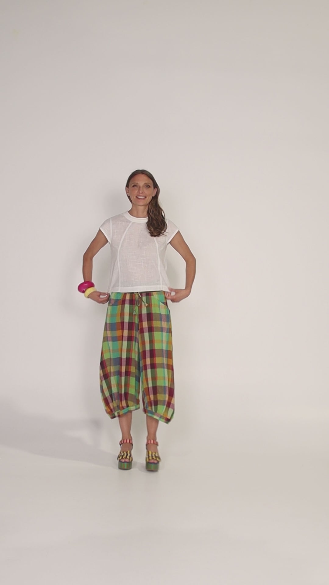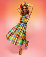 VIBE CHECK. Isabella Check brings a playful energy to your wardrobe with her vibrant palette of sunny yellows, earthy reds, lush greens, and breezy blues. Crafted from lightweight, crinkle cotton, this multicoloured plaid is effortlessly chic and beautifully carefree, no ironing required! Embrace relaxed sophistication as Isabella Check maintains her perfectly crinkled charm wash after wash. Pair these easy-to-wear silhouettes together for maximum impact or style them back with complementary solids, like our Pomodorro red Guru styles or acid wash denim staples for an elevated, versatile look.